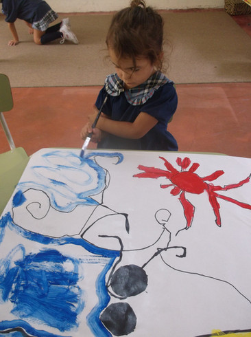 La siguiente clase, cada uno de los chicos eligió donde continuar trabajando sobre el proyecto de Miró. Mientras algunos jugaban dentro del cuadro de Miró, otros construían pequeños monstruos de formas como aquellos encontrados en las pinturas sus obras. También había un pequeño grupo re dibujando a gran escala los ojos de Miró y agregando los fondos seleccionados para la secuencia del paseo. Así como también había una mesa donde poder comenzar a pintar al ojo para luego incorporar los colores utilizados por Miró al diseño.