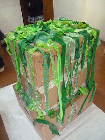 Los chicos investigan sobre la comida preferida de la tortuga porque el chocolate le va hacer mal a la panza como dijo Manu. Descubrieron que las tortugas comen lechuga y pepino, así que comenzamos a recolectar telas de diferentes tonos de verde para recrear la torta de lechuga.